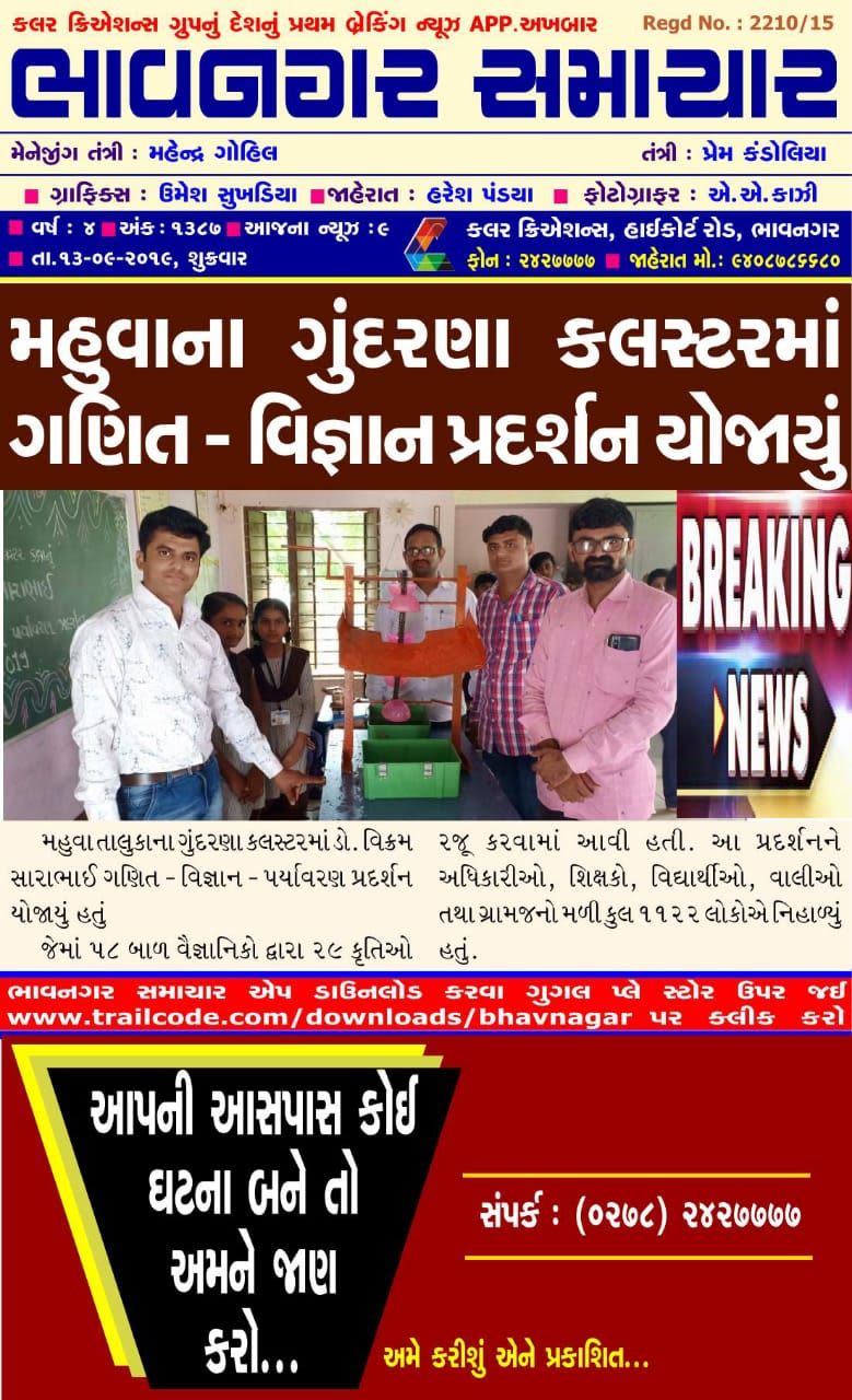 તારીખ 13 9 2019 ના રોજ અમારી શાળામાં વિજ્ઞાન મેળાનું આયોજન કરવામાં આવ્યું છે અને કસ્ટર કક્ષાના વિજ્ઞાન મેળામાં અમારી શાળામાં વિભાગ 4 માં પ્રથમ નંબર મેળવ્યો હતો